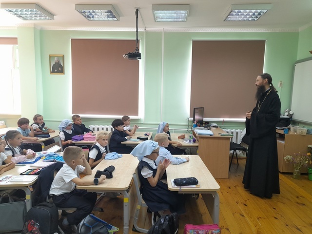 10 сентября старший священник храма Рождества Пресвятой Богородицы иерей Илия Родин познакомился с первоклассниками. На беседе батюшка рассказал ребятам о святом Герасиме, а также о важности беречь животных и заботиться о них.
